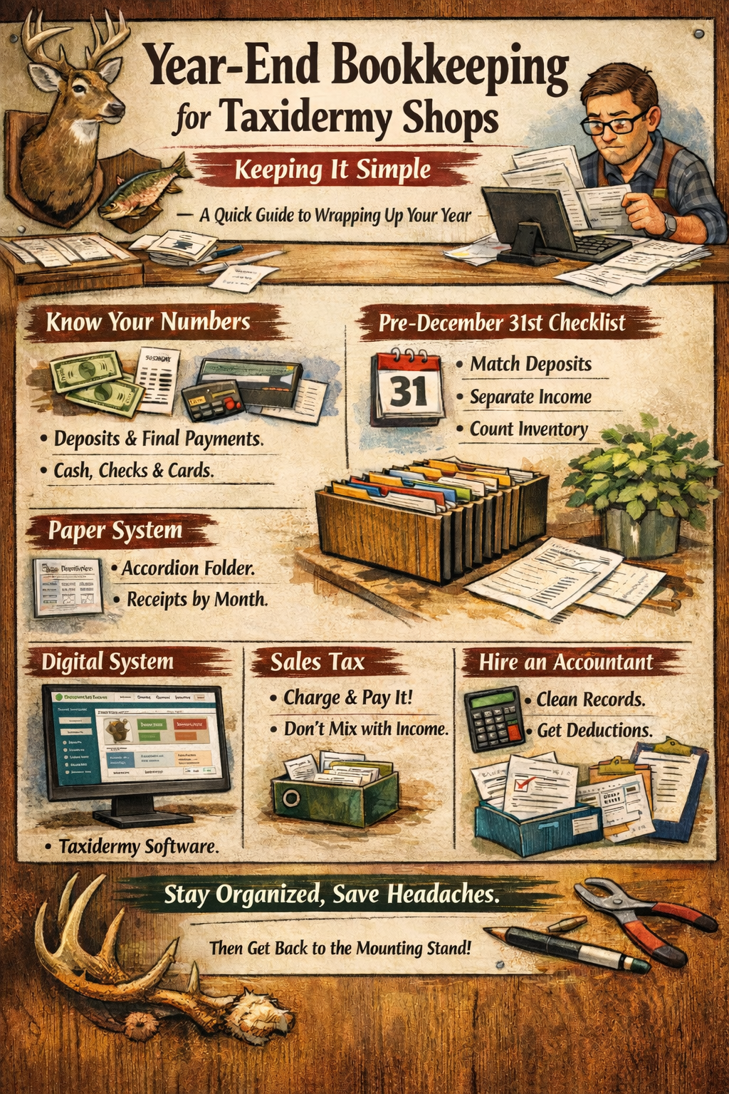 Most taxidermy shops aren’t messy—they’re just busy. A little organization now prevents a massive headache in April. Keep your receipts, match your deposits, and lean on a pro for the heavy lifting. Then, get back to the mounting stand.